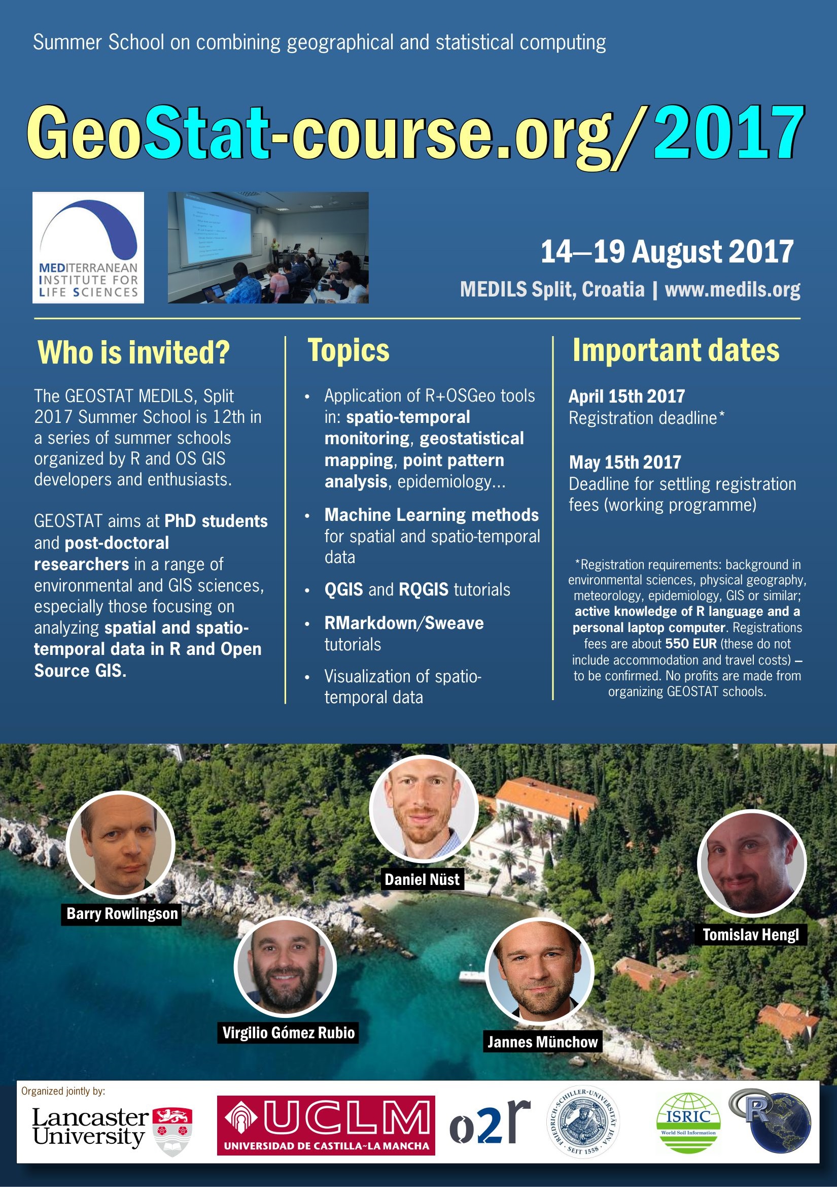 The GEOSTAT Split 2017 Summer School is 12th in a series of summer schools organized by R and Open Source (OS) GIS developers and enthusiasts. GEOSTAT aims at PhD students and researchers in a range of environmental and GIS sciences, especially those focusing on analyzing spatial and spatio-temporal gridded data in R and OS GIS.