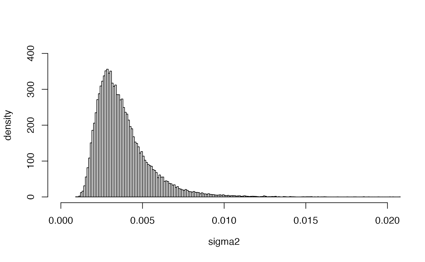 We focus now on the variance of the sampling model. Its posterior distribution is such that . This is not the posterior distribution of but a function, , of it. Consequently, we can approximate the posterior distribution for by simulation as follows:
