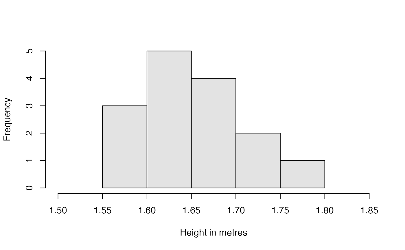hwomen <- data.frame(height = c(1.73, 1.65, 1.65, 1.76, 1.65, 1.63, 1.70, 1.58, 1.57, 1.65, 1.74, 1.68, 1.67, 1.58, 1.66))We can summarize the data and represent them by means of a histogram.