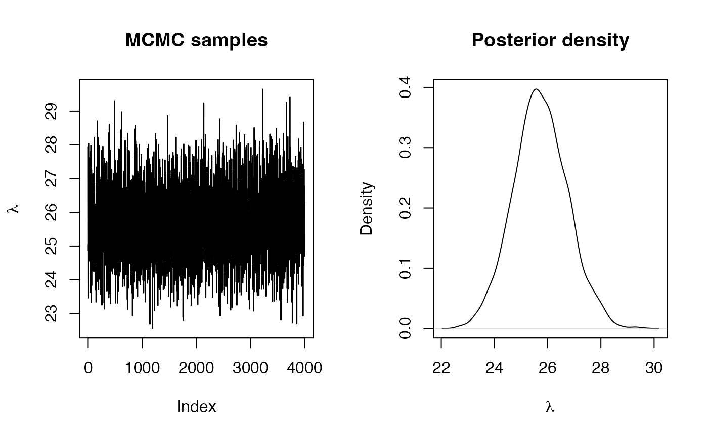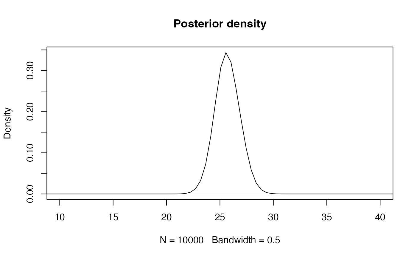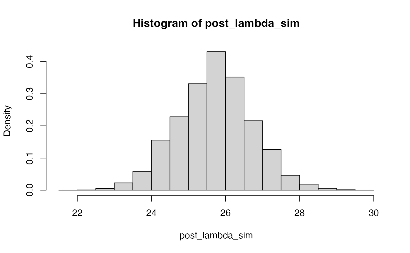 (post_mean <- sum(lambda_sim * ww))## [1] 25.71561