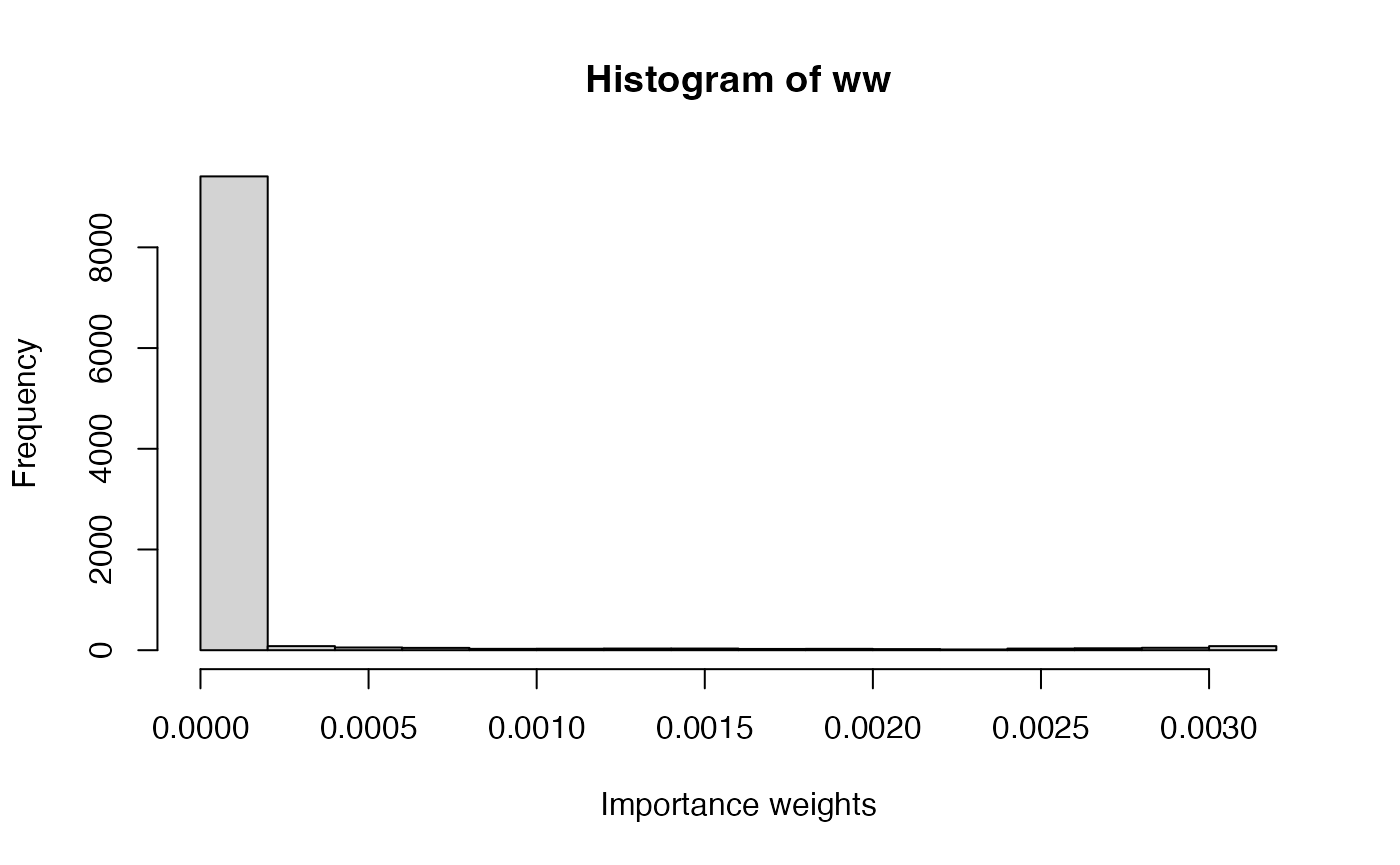 ww <- ww / sum(ww)The importance weights can be summarized using a histogram:
