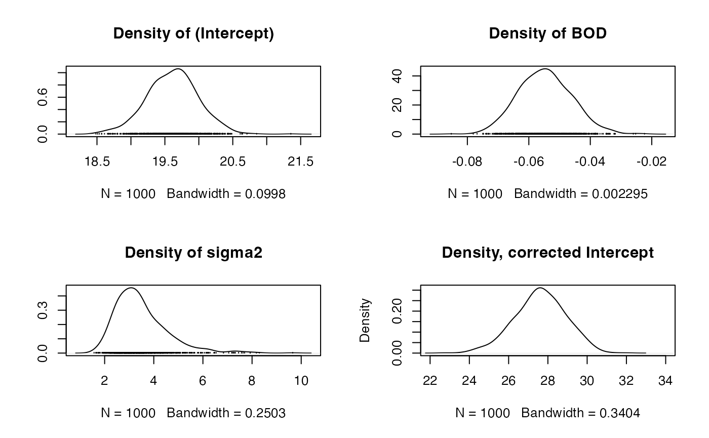 results2.beta.0 <- results2.simulations[,"(Intercept)"] - meanBOD * results2.simulations$BOD