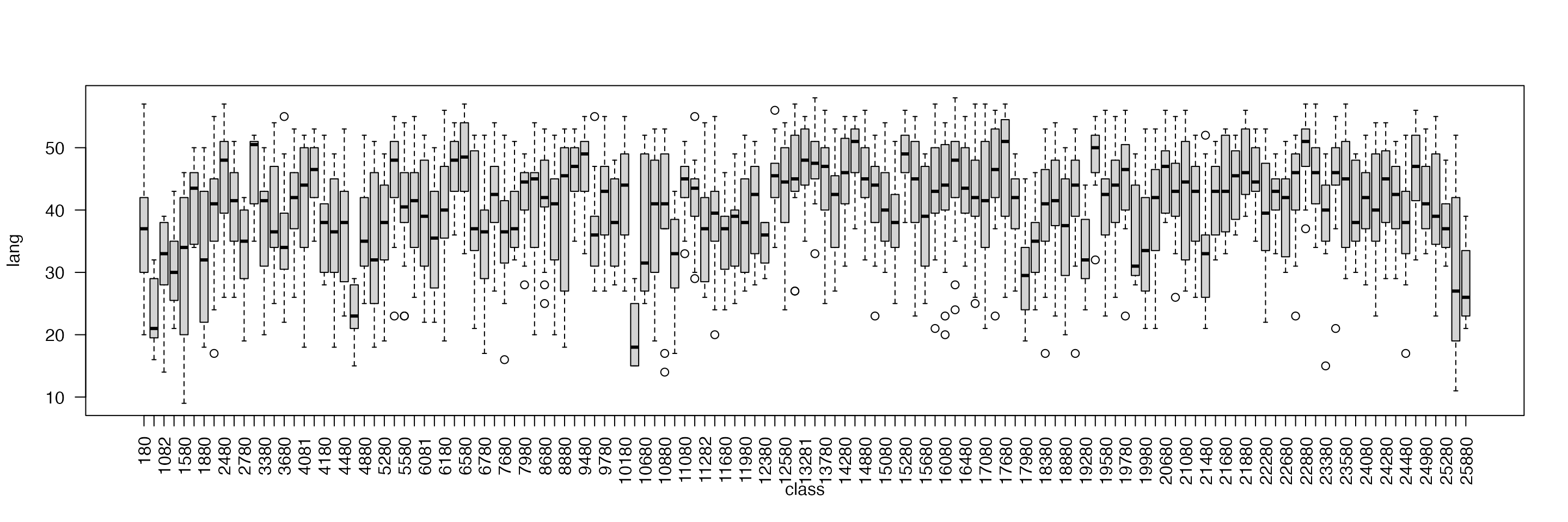 boxplot(lang ~ class, data = nlschools, las = 2)