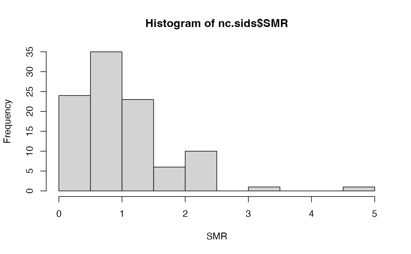 nc.sids$SMR74 <- nc.sids$SID74 / nc.sids$EXP74A summary of the SMR can be obtained: